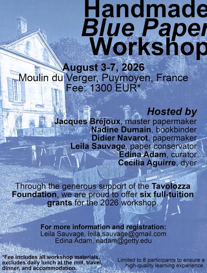 Applications should be sent to Leila Sauvage (leila.sauvage@gmail.com) and Edina Adam (EAdam@getty.edu) by 15 April 2026. Please include ‘Blue Paper Workshop Grant Application’ in the subject line.