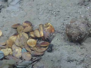 Gold coins and a gold box lie in situ. Hundreds of gold coins and more than 500,000 silver coins were discovered on the site. Photo from the Odyssey website.