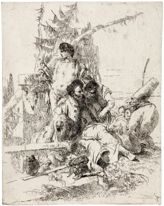 Tiepolo, "Punchinello Talking to Two Magicians" from the series "Scherzi di Fantasia," ca.1743–57, published 1775, Venice, etching on paper 23.3 x 18.3 cm (plate & sheet) A.R. Ragless Bequest Fund 1975, Art Gallery of South Australia