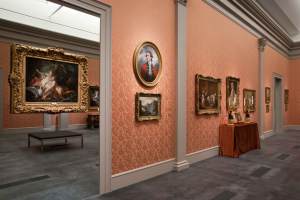 The Resnick collection also includes important Italian, Flemish, Dutch, and French paintings from the seventeenth and eighteenth centuries. Francesco Guardi’s Ridotto at Palazzo Dandolo (1750s), a recent addition to the collection, is a vivid image of gambling and masquerade in eighteenth-century Venice that evokes the risqué world of Casanova. Among the Northern paintings, the vigorous Revel of Bacchus and Silenus (c. 1615) executed by Jacob Jordaens while still in his twenties exudes verve and passion, and a rare pair of decorative tondos by the little–known Dirk van der Aa reveals an unexpected aspect of late eighteenth-century Dutch painting. Two French masterpieces frame the core group of late eighteenth-century works: Simon Vouet’s dignified representation of the goddess Diana and her companions from around 1640, and Jean Auguste Dominique Ingres’s magisterial The Virgin with the Host (1860). Both paintings, in spite of being worlds apart, lend a note of pure and austere classicism to the collection.