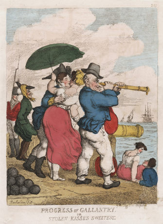 Thomas Rowlandson, “Progress of Gallantry, or Stolen Kisses Sweetest,” 1814, etching with stipple, in black ink with watercolor on cream wove paper (Yale University: Lewis Walpole Library)