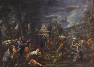 The pairing of the two subjects, one representing a pagan ceremony, the other a Jewish rite, corresponds to the artist’s (and perhaps the person commissioning) wish to illustrate two non-Catholic religious events although their association may seem a bit strange. Despite the fact that this seems to be the only known scene of a Jewish funeral by Magnasco, the painter also represented synagogue interiors on various occasions such as, for example, in a painting held in Cleveland.