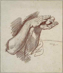 Jean-Baptiste Greuze, "The Arms of a Girl Holding a Bird," red chalk on cream paper, ca. 1765 (Austin: Blanton Museum of Art, The University of Texas)
