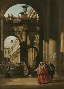 Bernardo Bellotto, Architectural Capriccio with a Self-Portrait of Bellotto in the Costume of a Venetian Nobleman, oil on canvas, 155 x 112 cm, 1760s — This painting contains one of the few self-portraits of Bellotto. He is depicted here lavishly clad in the traditional costume of Venetian nobility. The artist extends his arm in pride, inviting the viewer to admire the magnificent palatial setting, a testament of his exemplary artistic talent and innovation. Dating from the artist’s second Dresden sojourn between 1761 and 1767, the present work is the first of three known versions of the composition by Bellotto. Exhibited by Otto Naumann Ltd. Price: $11.5 million USD