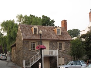 Last week I was in Washington, D.C. for a couple of meetings, and though I didn’t have lots of time for research and museum visits, I spent a balmy evening walking from the White House to Georgetown. At 3051 M. Street, just across from a Barnes & Noble bookstore, stands the Old Stone House. Built in 1765, it is the oldest surviving building in the Washington metropolitan area. At least according to my guidebook, it is, in fact, the city’s only colonial building still standing. Administered by the National Park Services, the house, with its six rooms and garden, is open to the public for free tours (I was unfortunately too late to see inside).