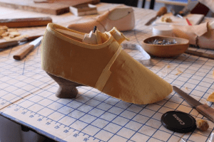 Sunday the 21st will be a short recess, and then the shoemaking class will begin in earnest at 8:00 a.m. on Monday morning, 22 August. The first hour-and-an-half or two hours will be a brief seminar on men’s and women’s shoe fashions, ca. 1700-1800, in which we’ll be attempting to “raise the bar” of the attendee’s awareness of stylistic and construction details in the various decades of the 18th-Century. This will most likely be open to the public for a $35 stand-alone fee, but that has not been confirmed.