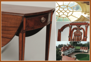 Guest cabinetmakers Dan Faia of The North Bennet Street School and Jeff Headley and Steve Hamilton of Mack S. Headley and Sons will lead us into the Federal period. Jeff and Steve will reproduce one of the Washingtons’ dining chairs made by John Aitken of Philadelphia in 1797, and Dan will construct a delicate, inlaid Pembroke, or breakfast, table. Colonial Williamsburg’s joiners will demonstrate sash construction by reproducing the famous bull’s-eye window in the pediment of the Mansion.