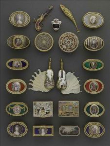 Chefs-d’œuvre de l’orfèvrerie, en or, enrichis de pierres dures ou précieuses, d’émail, de porcelaine, d’ivoire ou de nacre. . . étaient dès le XVIIIe siècle l’objet d’orgueil et de convoitise Leur forme était parfois étrange, prenant l’apparence d’un dromadaire, d’un tatou, d’une jambe, d’une tête, d’un violoncelle. . . Leur usage, participant aux rituels de la vie quotidienne, témoigne des pratiques de la sociabilité au Siècle des Lumières : le tabac, les modes cosmétiques, le jeu. . .