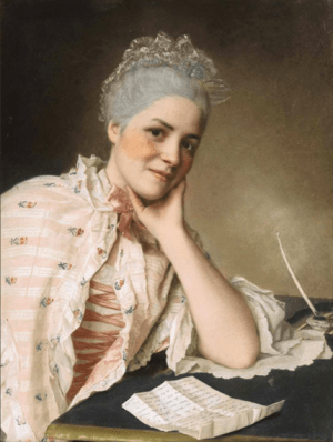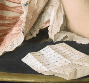 It is not unusual to find letters in Liotard’s portraits, but this one in particular is unusually explicit, and the only one to be partly legible. We can make out a string of compliments addressed to the young lady, such as ‘You know how much I am interested in and admire you… and your perfections.’ Such details suggest that it was the sitter herself, or one of her admirers, who chose this ambitious mode of representation – one that makes no allusion to her profession as a singer. Jacquet’s name has always been associated with the pastel; it was offered to the ancestors of the current owners by Louise Jacquet herself.