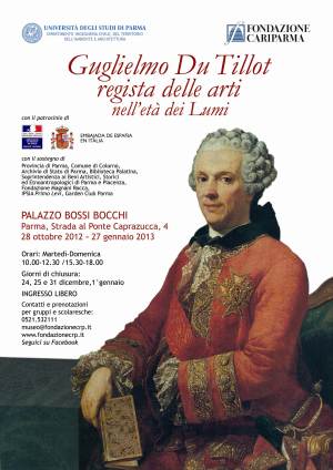 La mostra Guglielmo Du Tillot, regista delle arti nell’età dei Lumi si terrà a Palazzo Bossi Bocchi dal 28 ottobre 2012 al 27 gennaio 2013 (inaugurazione sabato 27 ottobre ore 18,00). L’esposizione, che si fregia del patrocinio delle ambasciate di Francia e di Spagna in Italia, è stata realizzata in collaborazione con Biblioteca Palatina di Parma, Soprintendenza per i Beni Storici Artistici ed Etnoantropologici di Parma e Piacenza, Archivio di Stato di Parma e IPSIA “Primo Levi” di Parma; l’obiettivo è di raccontare a un vasto pubblico l’impatto culturale e artistico della figura di Du Tillot, Intendente della Real Casa inizialmente e Primo ministro in seguito. Attraverso un ricco panorama di opere, talvolta inedite, di pittura, scultura, architettura, incisione, numismatica e arti decorative, nonché di preziosi volumi conservati nei fondi antichi della Biblioteca Palatina e della Biblioteca di Busseto, verrà illustrata la riforma artistica e culturale che permise al piccolo stato borbonico di emergere in Italia e in Europa come non era accaduto nemmeno sotto la dinastia farnesiana, facendo di Parma l’«Atene d’Italia».