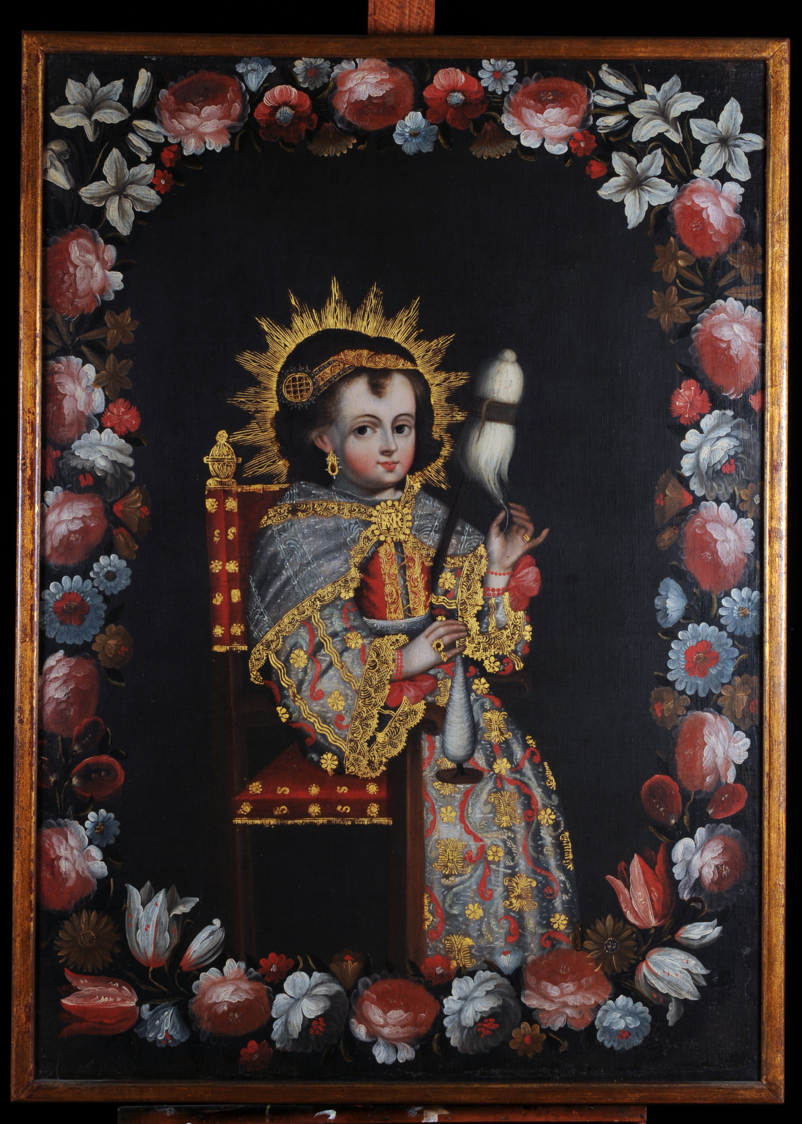 A particularly popular image in art during the Viceroyal period is that of the Virgin. Symbolic representations of the virtuous life of the Virgin Mary on view, such as Young Virgin Spinning, recalls the acllas, the Virgins of the Sun in the Inca empire, whose principal occupation was making garments for the Inca and for religious rites.