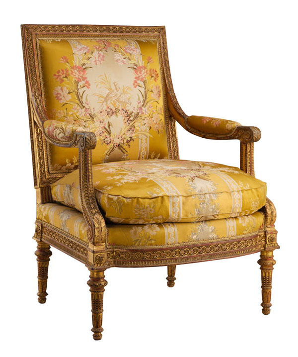 Georges Jacob; gilder: Louis–François Chatard. Armchair from Louis XVI’s Salon des Jeux, Château de Saint-Cloud, 1788. Carved and gilded walnut; gold brocaded silk (New York: The Metropolitan Museum of Art, Gift of J. Pierpont Morgan, 1906 — 07.225.107)