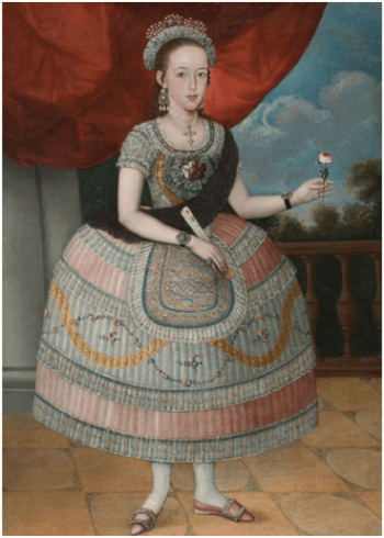 An engaging, if unnamed, woman stands full-length before the viewer; the rather summarily painted backdrop contrasts with her richly-embroidered costume, including a dress with a high hemline, a stylized apron, a dark shawl, silver and pearl jewelry, and fine silk shoes with buckles. The embroidery includes undulating floral garlands and attached ribbons and pleats that together create a dense Baroque field of imagery, although the pastel colors of the dress might indicate the impact of the Rococo. The high hem of the dress is surely an indication of the date of the picture, or perhaps the status of the subject. There is also something strikingly modern about the stiff almost geometrical forms. Her bell-shaped dress and small apron are typical of those worn by women in this period from Peru and Bolivia, where French fashions apparently had less of an impact.