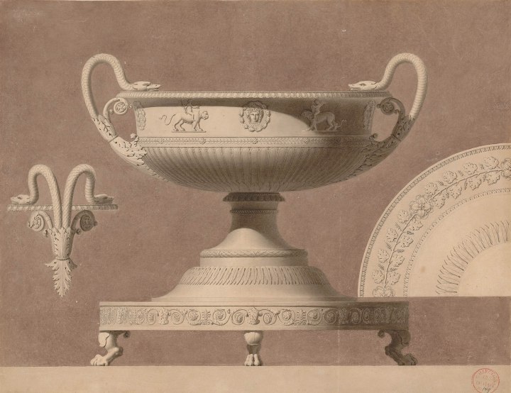 ‘Snake handles’ dish, attributed to Charles-Jean-Alexandre Moreau, creator of the model; drawing attributed to Auguste Garneray, draughtsman in Jean-Baptiste-Claude Odiot’s workshop, ca. 1810; graphite, pen and grey ink, grey and sepia wash on paper (Paris: Les Arts Décoratifs).