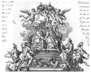 In January 1722 after a few days of heavy rain in Rome the ephemeral ‘macchina d’artificio’ built to celebrate the wedding between the Prince of Asturias and Isabel d’Orleans was finally burnt before the palazzo di Spagna. The machine, designed by Domenico Paradisi, showcased a clear message of unity and power between the former enemies: France and Spain. At the summit, allegories of both countries shook hands before the representation of the Four Continents. This functioned as a gentle reminder to their enemies after the years of turmoil surrounding the War of Spanish Succession, which had deeply affected the balance of power in Europe.