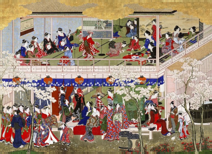 Kitagawa Utamaro, Cherry Blossoms at Yoshiwara, ca. 1793; ink, gouache, gold and gold leaf on bamboo paper