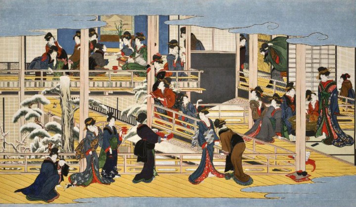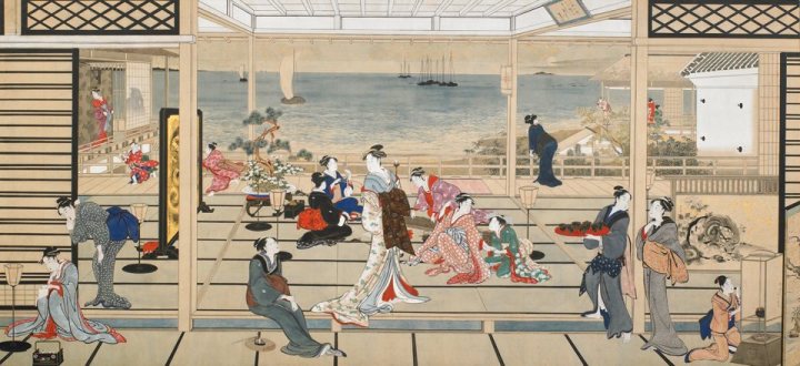 The Sackler exhibition explores the carefully constructed persona of Utamaro and the many questions surrounding his work and subject matter. The trio, painted in ukiyo-e style, idealize Edo’s (modern day Tokyo) ‘floating world’—pleasure centers of leisure, consisting of numerous brothels, which served as diversions from the pressures of everyday life. Unusual in scale and meticulously detailed, the three paintings portray the romanticized lives and appearances of workers of these quarters. Little is known about Utamaro’s life, but to this day he is considered one of the greatest artists of the ukiyo-e genre.