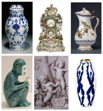 From top left: Saint-Cloud Vase, 1695–1710 (New York: The Metropolitan Museum of Art); Bastien & Bugeard Clock, 1848–58 (Paris: Musée des Arts décoratifs); Mennecy Jug, 1760 (London: Victoria and Albert Museum); Villeroy Monkey, 1745 (New York: The Metropolitan Museum of Art); Guérhard & Dihl Vase, 1797–1804 (Clandon Park, National Trust); and Bernardaud Vase, 2015, by Hervé Van Der Straeten.