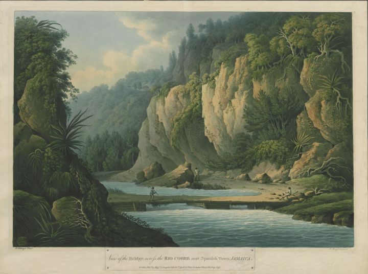 J. Mérigot after Louis Bélanger, View of the Bridge across the Rio Cobre near Spanish Town, Jamaica; etching, aquatint, hand colouring; published in London, 20 April 1800 (London: British Library, Maps K.Top.123.55.b). This sublime aquatint of the River Cobre in Jamaica is after a design by Louis Bélanger. It is part of a series of six. There is no record of Bélanger ever visiting Jamaica. It appears that he adapted his designs for this work and another view in the series from George Robertson’s paintings of the island, available in print from the 1770s (see BL Maps K.Top.123.54.f.). The image is included in Miles Ogborn’s article for Picturing Places: “Slavery, Freedom and the Jamaican Landscape.”