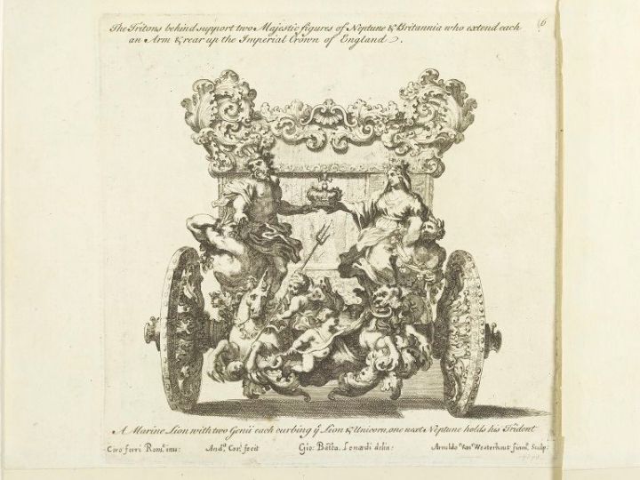 Design for a Carriage Built by Andrea Cornely after a design by Ciro Ferri, engraving published in An Account of His Excellence, Roger Earl of Castelmaine’s Embassy from His Sacred Majesty James the II King of England, Scotland, France and Ireland &c. To His Holiness Innocent XI (London, ca. 1687). London: V&A 19393. Inscriptions read: “The Tritons behind support two Majestic figures of Neptune & Britannia who extend each / an Arm & rear up the Imperial Crown of England’ and in the lower center of the plate, “A Marine Lion with two Genii each curbing ye Lion & Unicorn, one next Neptune holds his Trident.”