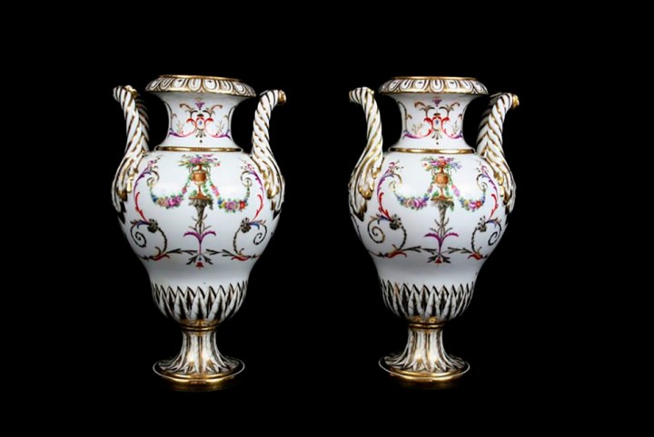 Manufacture de Monsieur le duc d’Angoulême, Paris, Pair of Vases, ca. 1785, porcelain with enamel and gilded decoration; each 9 × 5.5 × 5.25 inches (The Frick Pittsburgh Collection).