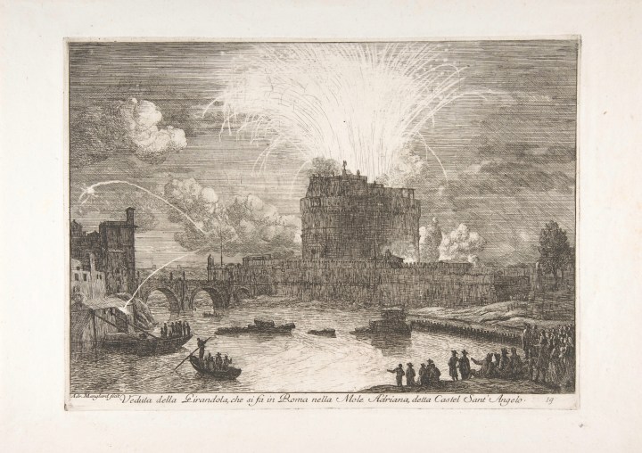 Adriaen Manglard (French, 1695–1760), Fireworks in Rome Over Castel Sant’ Angelo, etching, plate: 23 × 31 cm (New York: The Metropolitan Museum of Art, 67.542.26).