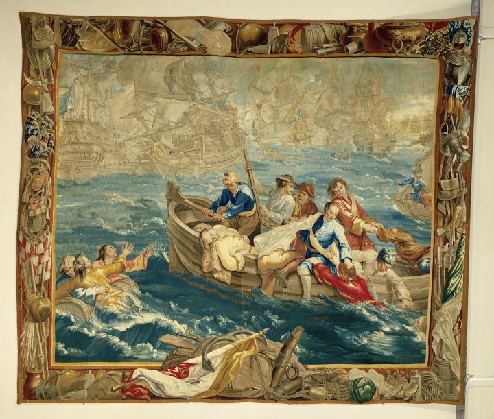 Judocus de Vos, after Lambert de Hondt, Lucas Achtschellinck, and Jan van Orley, Naval Battle from the Art of War series, ca. 1715–20; wool and silk, 344 × 400 cm (Amsterdam: Rijksmuseum).