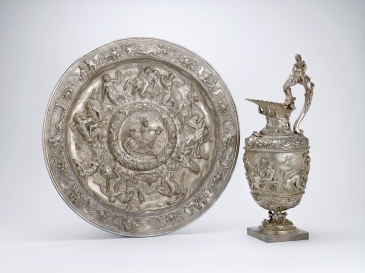 The silver ewers—weighing some fifteen pounds (or five kg) and worth 300 Roman scudi each—were meticulously embossed and chased with scenes celebrating the most illustrious members of the House of Medici from Lorenzo the Magnificent down to the reigning Grand Dukes. It was probably the fact that the ewers depicted the unusual subject of her family’s history that prompted the Electress Palatine Anna Maria Luisa (1667–1743) to do everything in her power to safeguard them from the threat of destruction at the hands of the House of Lorraine, who succeeded the Medici on the throne of Tuscany and whose military expenditure meant that they were regularly strapped for cash.