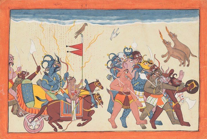 The Demon Dhumraksha Leads His Army, North India, Kulu or Bahu, ca. 1700–10; opaque watercolor on paper (The San Diego Museum of Art, Edwin Binney 3rd Collection, 1990.1107).