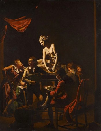 In An Academy by Lamplight, Wright of Derby tackles a subject with a long and illustrious history dating back to the first academies of art established during the Renaissance in Italy. Wright may have been inspired by the profusion of such organisations in 18th-century Europe and especially in Britain, where the Royal Academy in London was founded just a year before the work was painted, in 1768. The picture depicts six young draughtsmen contemplating the cast of Nymph with a Shell, an antique Hellenistic statue much admired in the 18th century when it was housed in the Villa Borghese in Rome. Today it can be found in the Louvre.