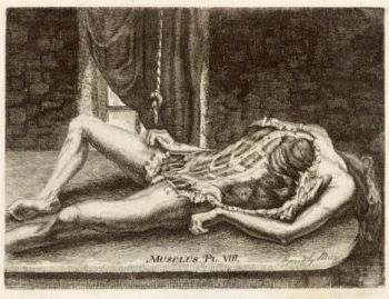 John Bell, Reclining Male Cadaver, from Anatomy of the Bones, Muscles, and Joints, by John Bell, 1794, engraving and etching (Austin: Blanton Museum of Art, The Karen G. and Dr. Elgin W. Ware, Jr. Collection, 2000.4).