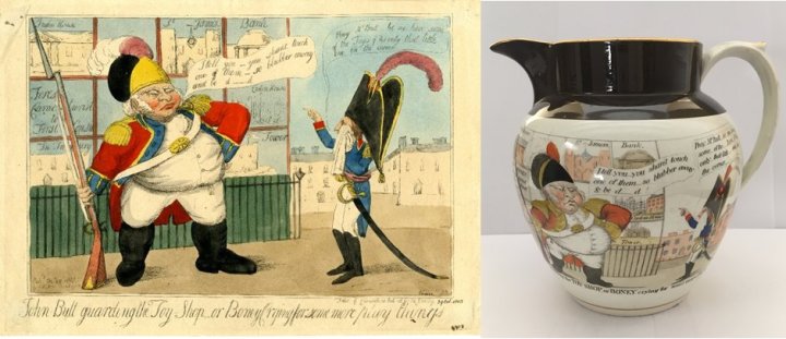 The imagery became increasingly cruel, especially during Napoleon Bonaparte’s threatened invasion in 1803, when prints as government funded propaganda stirred up the populace with nasty images of the Corsican tyrant. Just weeks before the collapse of the Peace of Amiens in May 1803, a caricaturist captured a colossal ‘Boney’ with a foot firmly planted in Germany about to straddle the English Channel. A feisty, pint-sized John Bull with a blood stained sword has sliced off his toes, while exclaiming ‘Paws off, Pompey’, associating Bonaparte with the hero of a popular novel, a lap-dog, known as ‘Pompey the Little’.