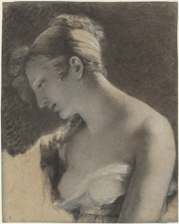 Pierre-Paul Prud’hon, Head of a Woman: Study for The Happy Mother (L’Heureuse mère), 1810, black and white chalk, stumped, on blue paper (Los Angeles: The J. Paul Getty Museum).