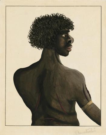 Port Jackson Painter, Half-length Portrait of Gna-na-gna-na, ca. 1790, gouache (Canberra, National Library of Australia, Rex Nan Kivell Collection NK144/D).