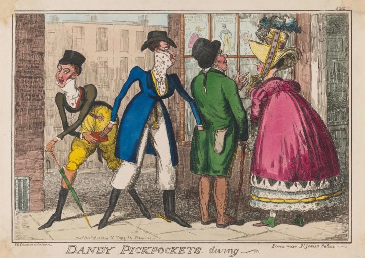 Isaac Robert Cruikshank, Dandy Pickpockets, Diving, 1818 hand-colored etching