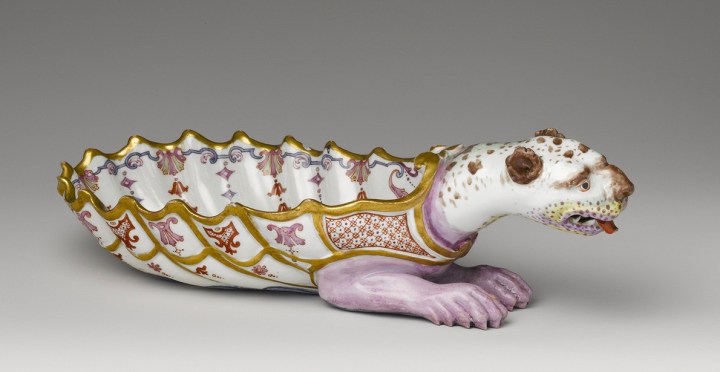 Claudius Innocentius, Du Paquier, Panther Bowl, ca. 1730, glazed, painted, and gilt porcelain, 8 × 25.5 × 10.3 cm
