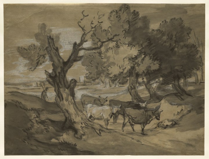 Thomas Gainsborough, Landscape with Herdsman Driving Cows and Distant Buildings, mid to late 1780s, black chalk over brush and gray wash with lead white on beige laid paper, fixed with gum (Williamstown: The Clark Art Institute, gift of the Manton Art Foundation in memory of Sir Edwin and Lady Manton, 2007.8.77).