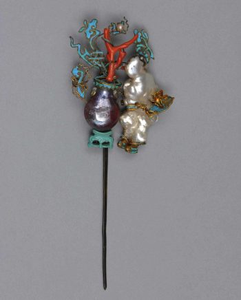 Hairpin with Figure and Vase, 18th or 19th century, pearls, sapphire, coral, turquoise, kingfisher feather, and silver with gilding (Beijing: Palace Museum, Gu10130).