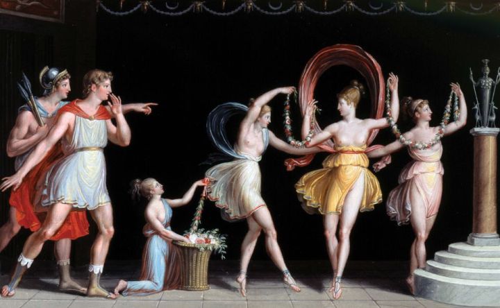 Antonio Canova, Theseus and Pirithous in the Temple of Diana Ortia See Diana Dancing, between Two Dancers, in Front of the Figure of Artemis of Ephesus (Abduction of Helen), 1799, tempera (Possagno: Gypsotheca e Museo Antonio Canova). The painting is one of 34 works inspired by Pompeiian wall paintings.