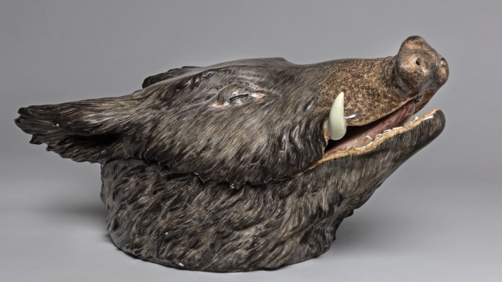 Boar’s Head Tureen, France, probably Strasbourg, ca. 1745; tin-glazed earthenware (faïence)
