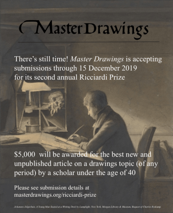 Master Drawings announces an extended deadline of 15 December for submissions to the second annual Ricciardi prize. $5,000 for the best new and unpublished article on a drawings topic (of any period) by a scholar under the age of 40.