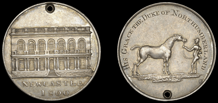 Lot 276: Northumberland, Newcastle-upon-Tyne, Newcastle Grand Stand, 1800, silver, unsigned, grandstand, rev. horse standing right, held by a jockey, named (His Grace the Duke of Northumberland), 31mm, 15.05g (W 1545; D & W 323/17; cf. DNW 157, 1319-20). Pierced for suspension, very fine and toned, very rare, estimate: £300–400.