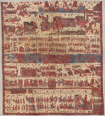 Hanging Depicting a European Conflict in South India, before 1763; Indian, Coromandel Coast, for British Market; cotton, plain weave (drawn and painted resist and mordant, dyed), 117 × 103 inches (New York: The Metropolitan Museum of Art).
