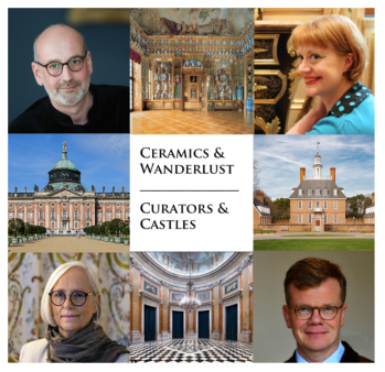 Wanderlust, our need to travel to study ceramic collections in museums and castles throughout Europe and Britain, is at the heart of the French Porcelain Society’s educational activities. It has been over a year since our last visit to France and our next visit may not be for several months. In order to share the pleasure of exploration, comradery, and discovery associated with these trips, Patricia Ferguson with the help of Félix Zorzo and other members of the French Porcelain Society committee have organised a two-day virtual symposium on the 13th and 14th of March. From the recently installed porcelain cabinet at the Château de Versailles to the stunning Porzellankabinett in Schloss Charlottenburg, as well as state, royal, and aristocratic collections from Lisbon, Kassel, and Colonial Williamsburg, their directors and curators have enthusiastically agreed to be part of our programme. We are extremely grateful to the knowledgeable custodians of some of our favourite castles and country houses, who have captured private tours for our global audience on video. Each unique and very personal tour has been pre-recorded, but there will be a live Q&A panel at the end of each day led by Dr. Caroline McCaffrey-Howarth.