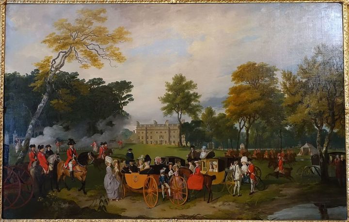 Francis Wheatley, The Earl of Aldborough Reviewing Volunteers at Belan House, County Kildare, 1782 (later changes ca.1787 and extended ca.1810), oil on canvas, 155 × 265 cm (National Trust, Waddesdon Manor, bequeathed by James de Rothschild, 1957).