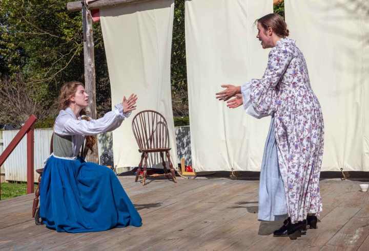 Members of Jug Broke Theater Company performing Ladies of Llangollen, by Claire Wittman. Based on the lives of Eleanor Butler and Sarah Ponsonby, who eloped together in 1778, the play premiered on 10 April 2021 (Photo from the Colonial Williamsburg; by Wayne Reynolds).