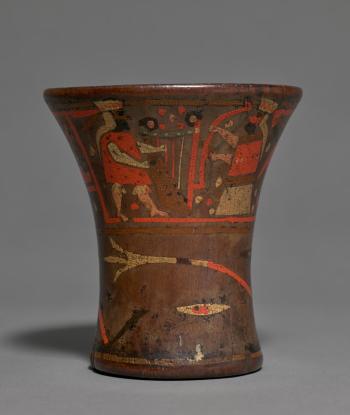 Waisted Cup (Kero) Depicting Two Musicians and Floral Elements, late 15th–18th century, Quechua, Colonial Period, Peru; wood, natural resin, and pigments, 6 × 5 × 5 inches (Houston: The Menil Collection, photo by Paul Hester).