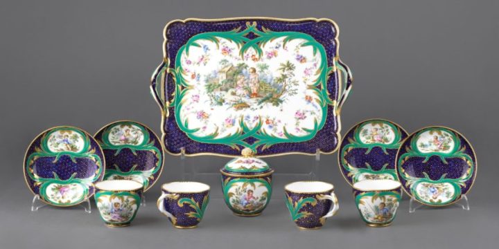 Tray and Tea Service (déjeuner ‘Courteille’, four gobelets ‘Hébert’ et soucoupes, pot à sucre ‘Bouret’), Manufacture de Sèvres, soft-paste porcelain, painted and gilded, lapis and green ground painted with children in landscapes by André-Vincent Vielliard, date letter F for 1759; probably bought by Mme de Pompadour in December 1759 (London: The Wallace Collection, C401-06).