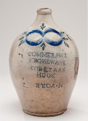 Thomas W. Commeraw, Jug, ca. 1796–1819, stoneware and cobalt oxide. Impressed on front: “COMMERAW’S/STONEWARE / CORLEARS / HOOK / N. YORK” (New-York Historical Society, 1937.820).