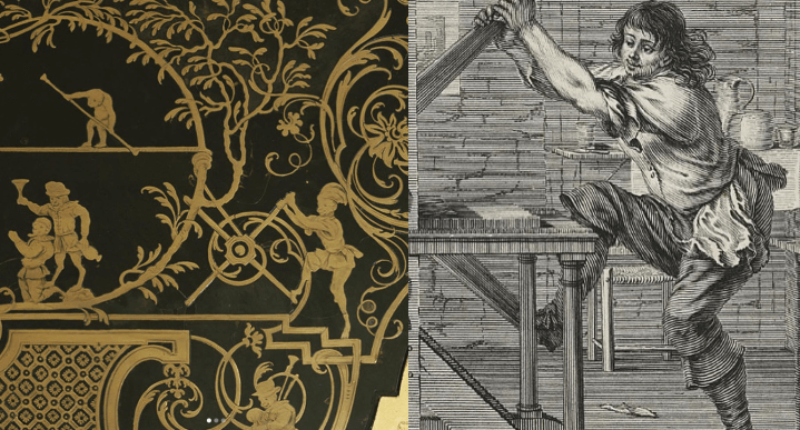 Left: André-Charles Boulle, detail of a table, veneered in turtleshell and brass, with gilt-bronze mounts, ca. 1705 (London: The Wallace Collection, F56). Right: Abraham Bosse, ‘Cette figure vous montre comme on Imprime les planches de taille douce…’, 1642, etching (London: British Museum, R,8.15).